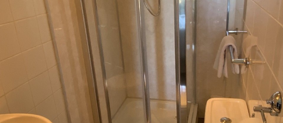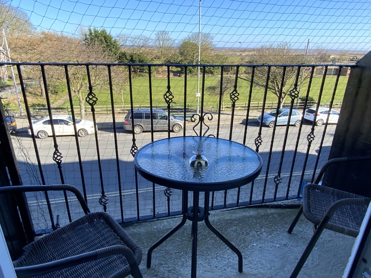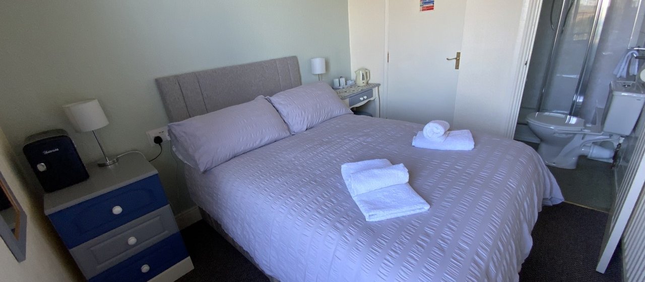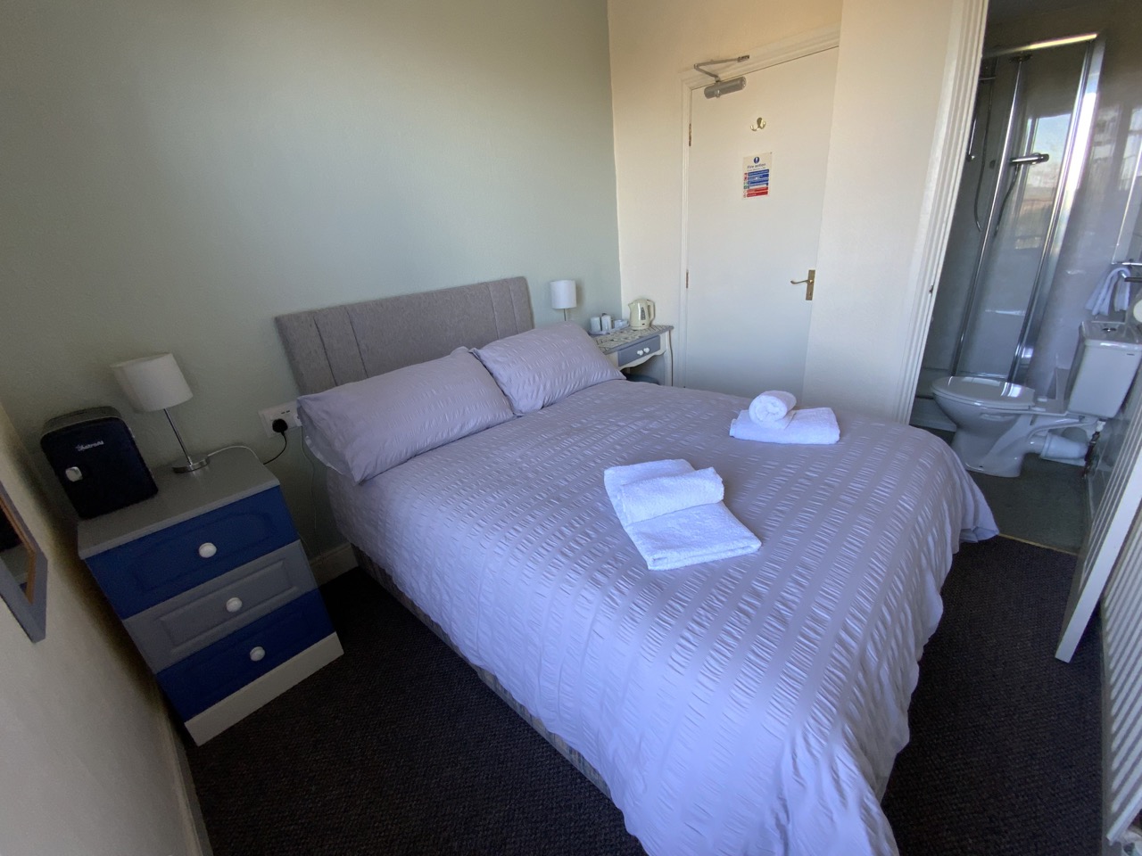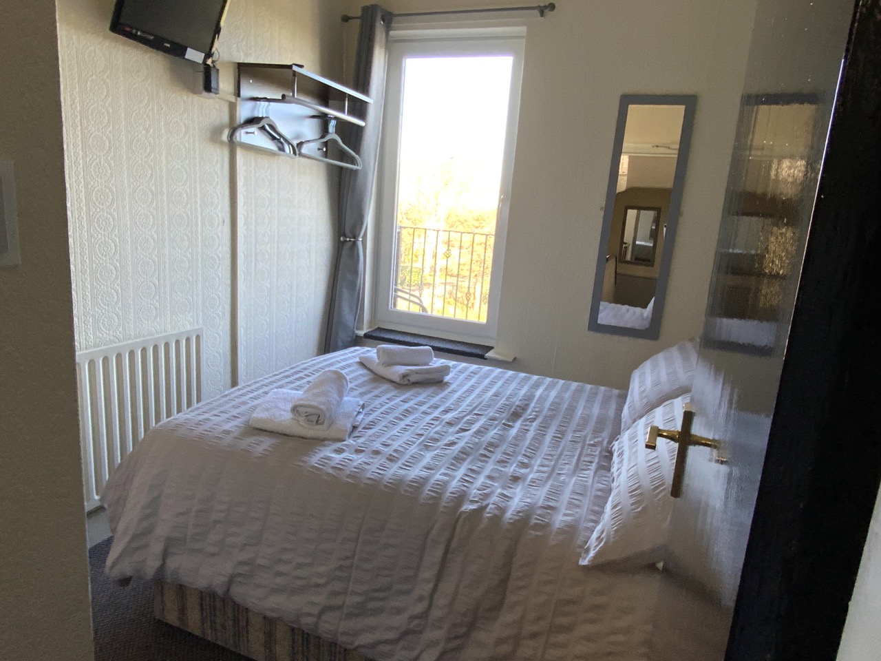 Small double room with sea view and balcony. Has a small double bed and steps out onto a balcony, offering fabulous sea views. The balcony is under cover and has a table and chairs.