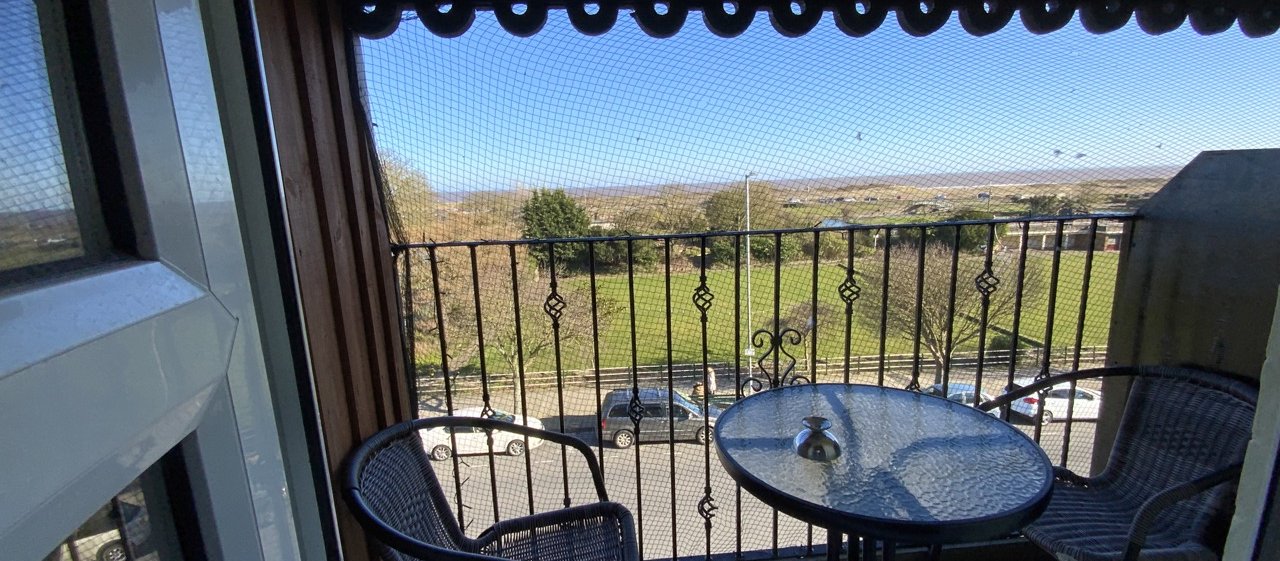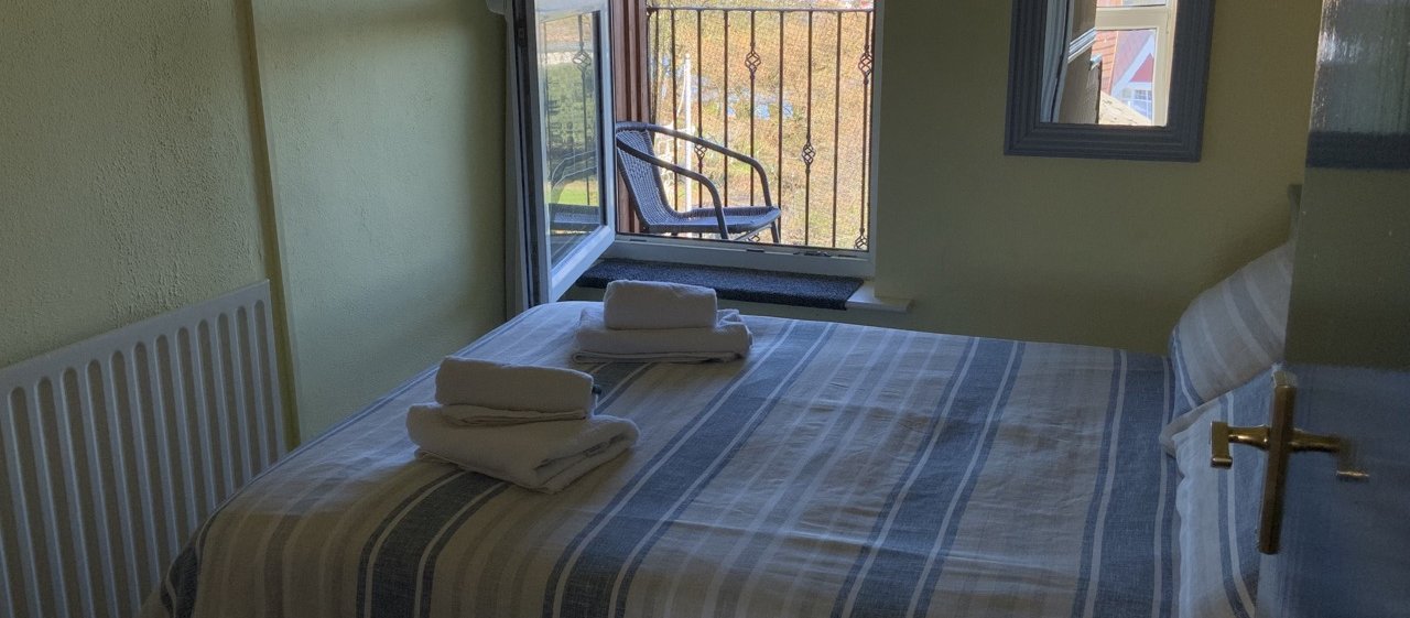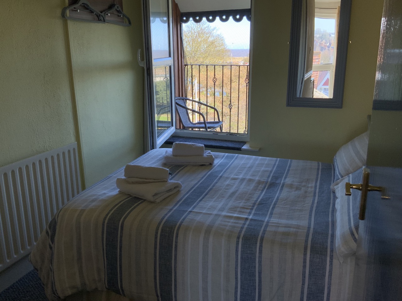 Small double room with sea view and balcony. Has a small double bed, and steps out onto a balcony offering panoramic sea views. The balcony is under cover, and has a table and chairs.